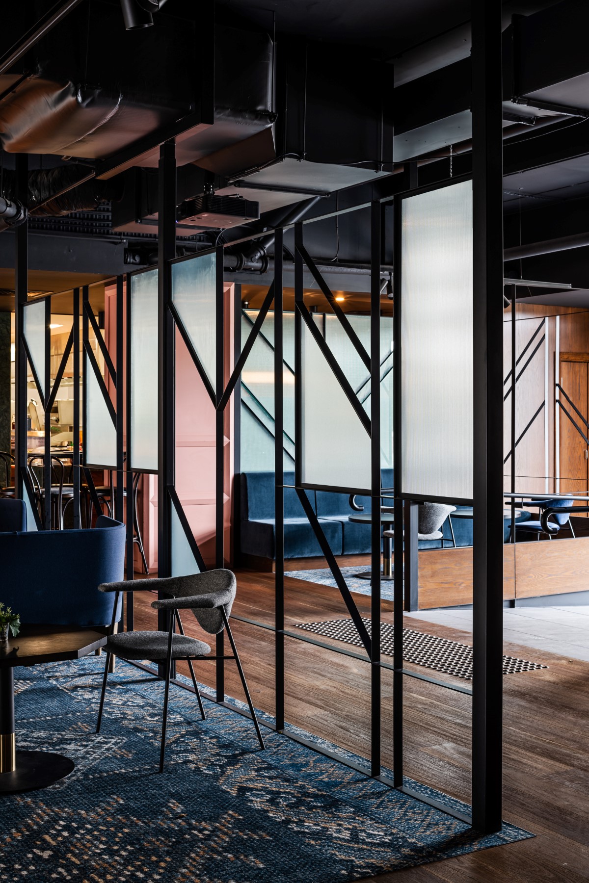 The glazed screens throughout pay tribute to the old vintage tram interior seat divisions.