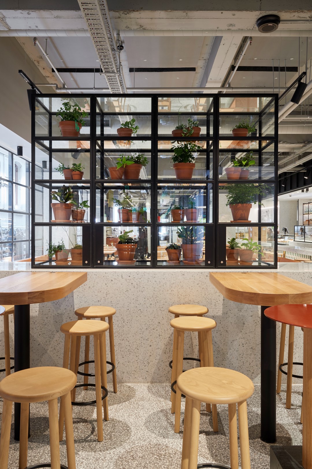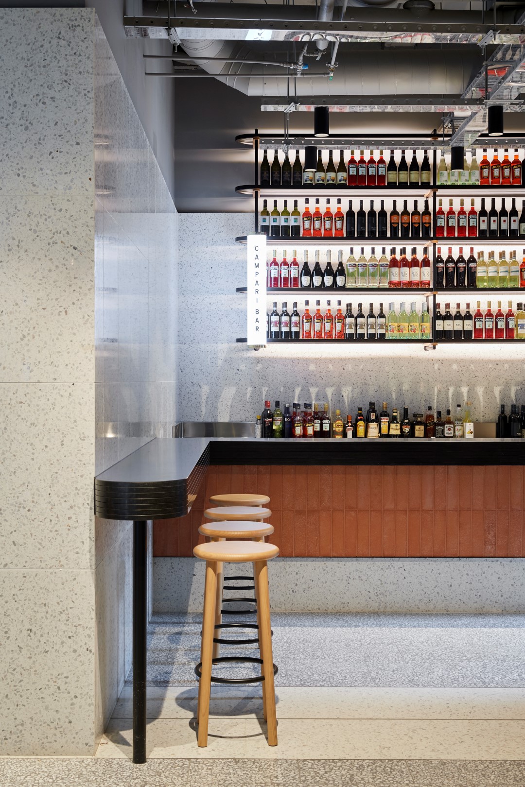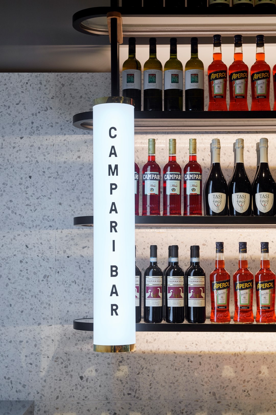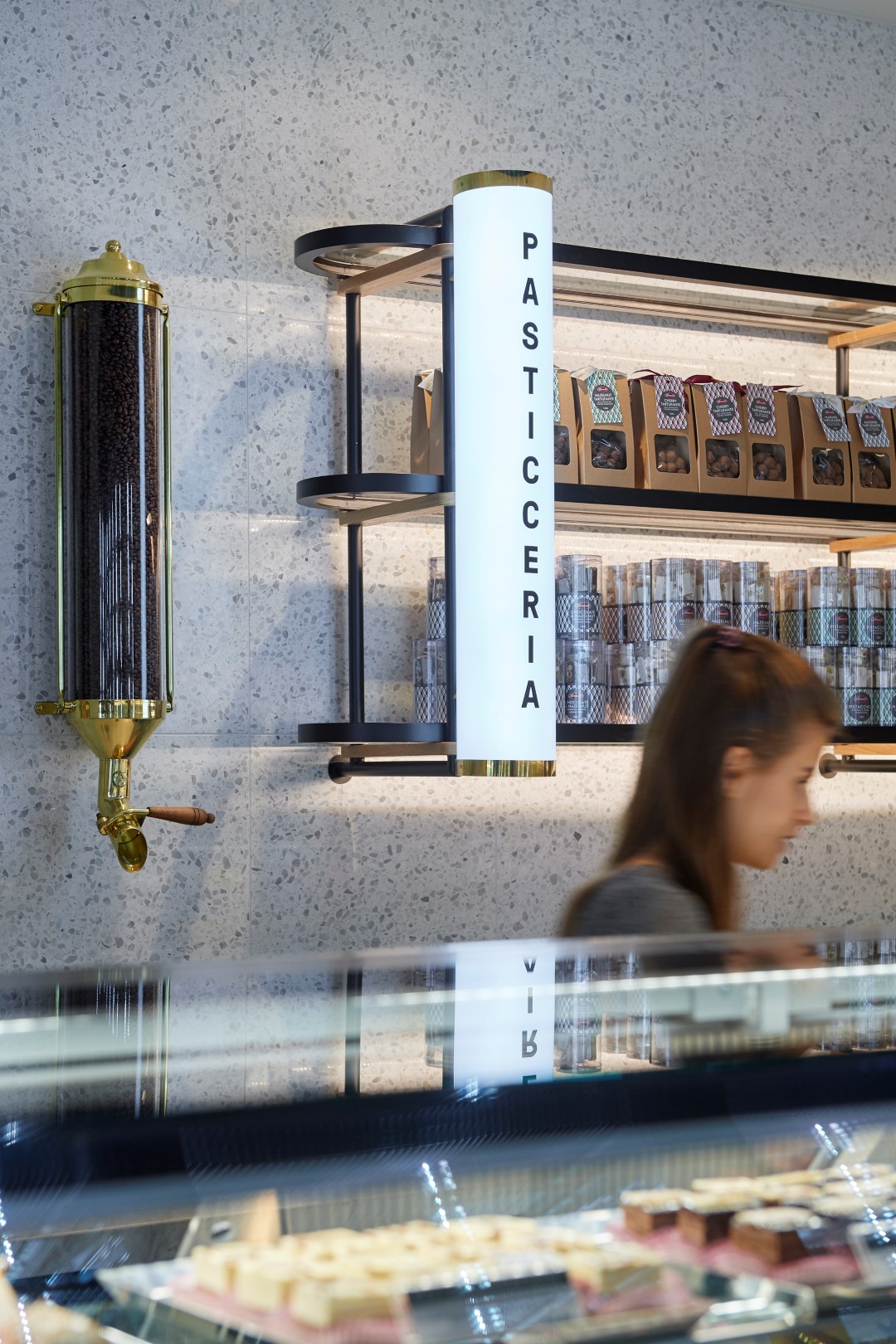 Solid volumetric forms and geometries feature throughout the space, which contrast with lighter fine steelwork on facades and display cases. Honouring the Italian tradition, there is a liberal use of terrazzo, marble and cut stone, with the design built up through blocks of contrasting materials. We sought to explore materials with textural contrast, juxtaposing refined and raw materials.