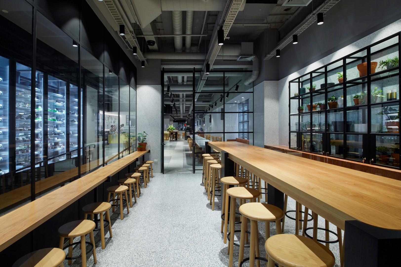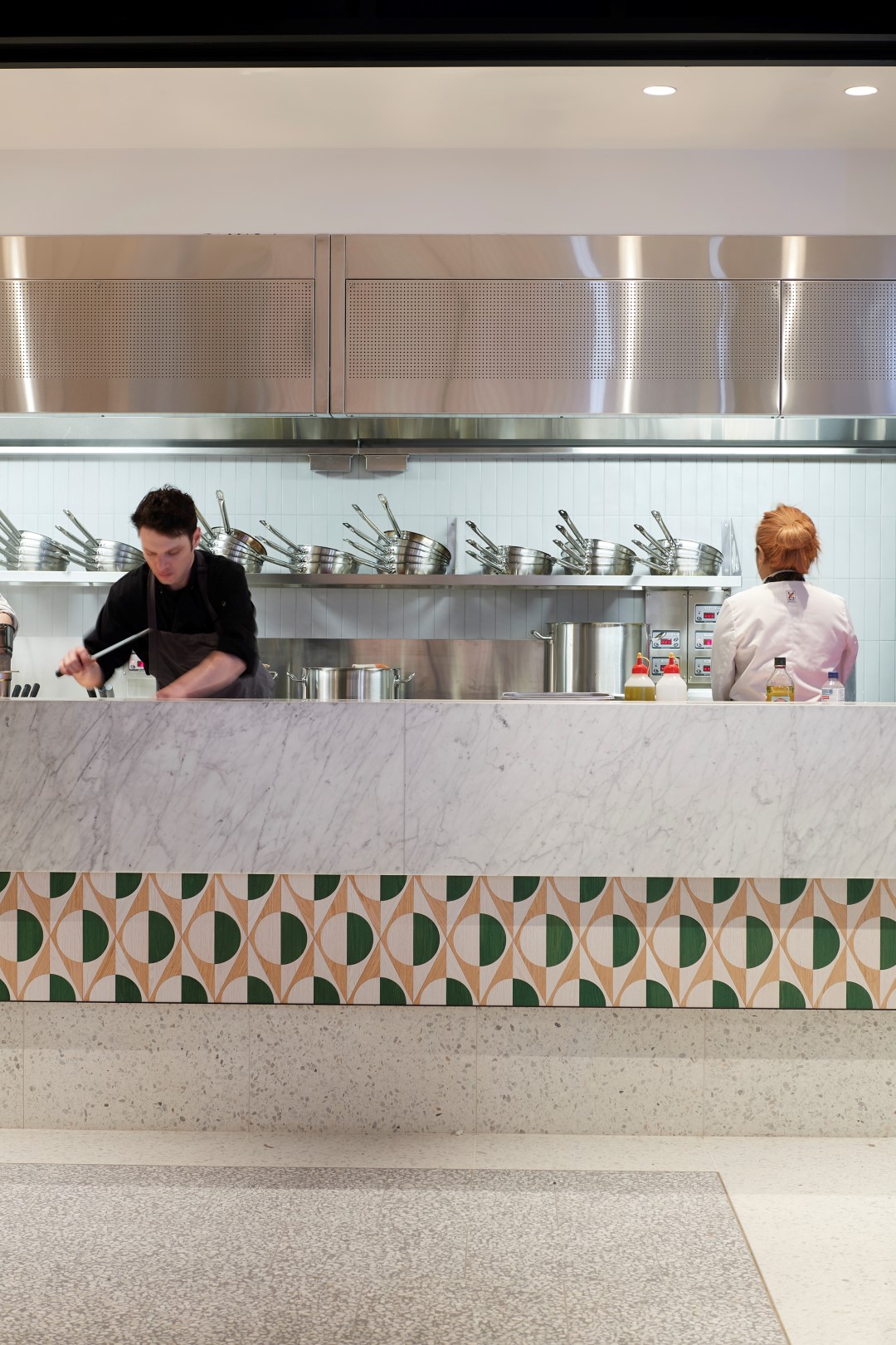 The overall atmosphere is quite relaxed. The flow of spaces allows for a mix of experiences, from a quick coffee to lingering while dining.  An open kitchen and the hero horseshoe coffee bar provide theatre and create a sense of activity.