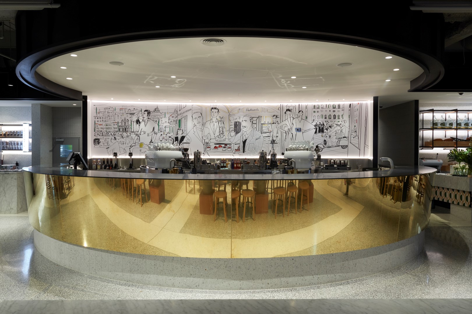 The design emphasises Italian design influences and materiality while providing a highly theatrical hospitality experience.