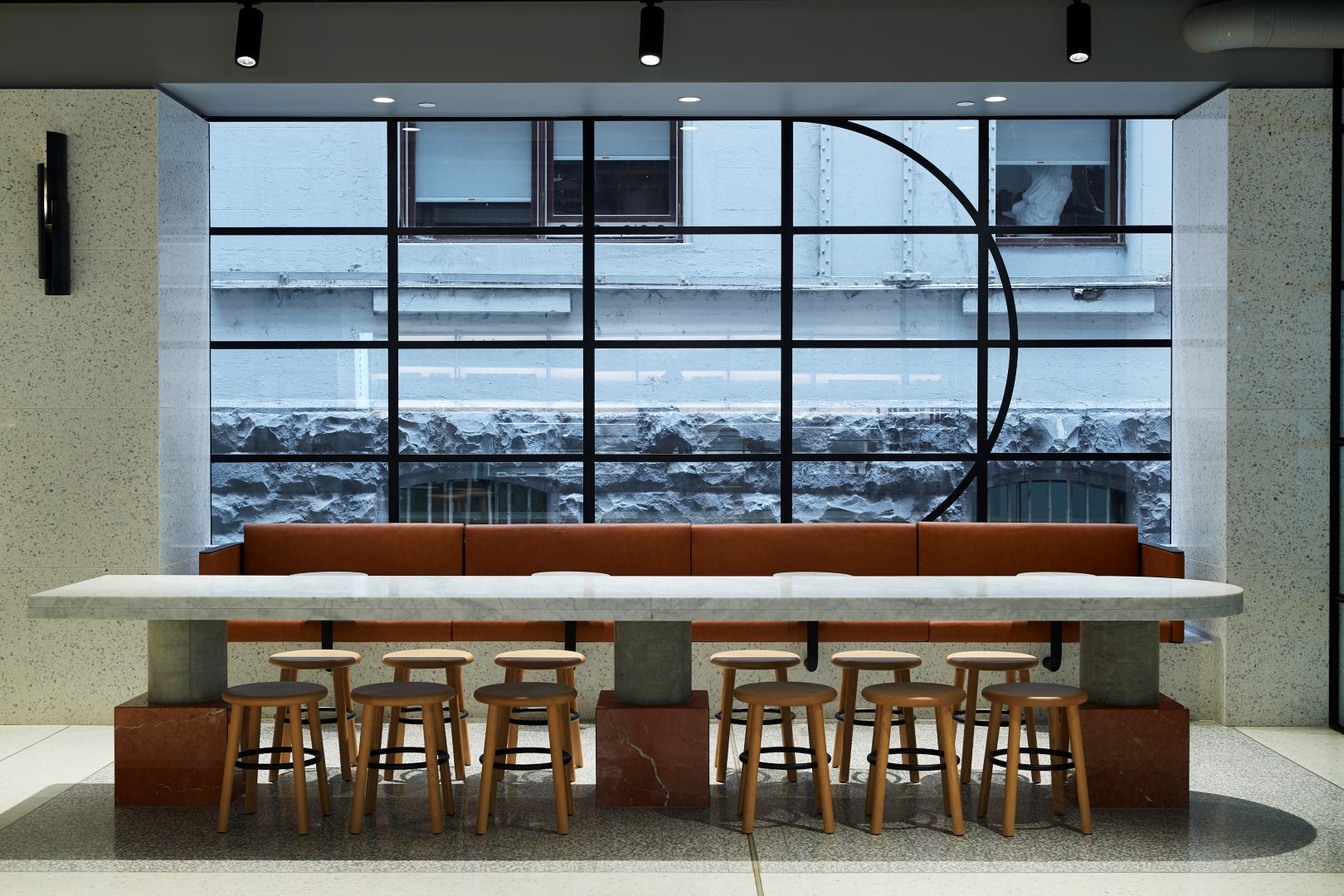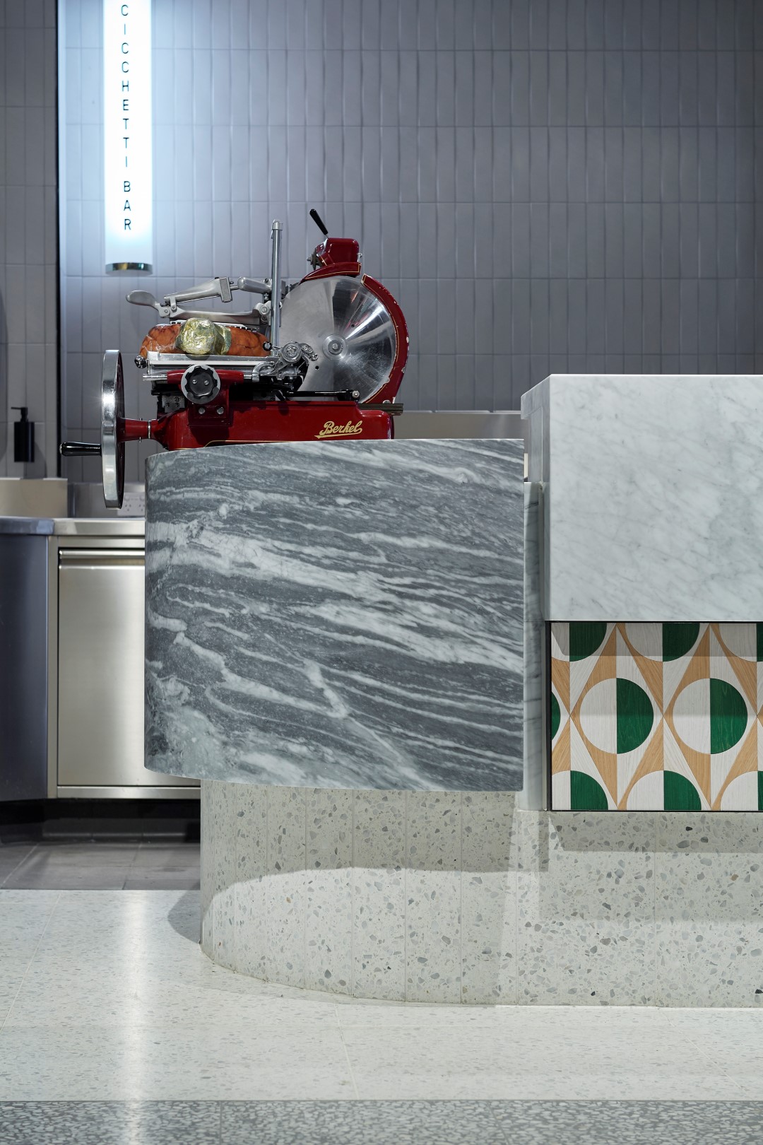 Solid volumetric forms and geometries feature throughout the space, which contrast with lighter fine steelwork on facades and display cases. Honouring the Italian tradition, there is a liberal use of terrazzo, marble and cut stone, with the design built up through blocks of contrasting materials. We sought to explore materials with textural contrast, juxtaposing refined and raw materials.