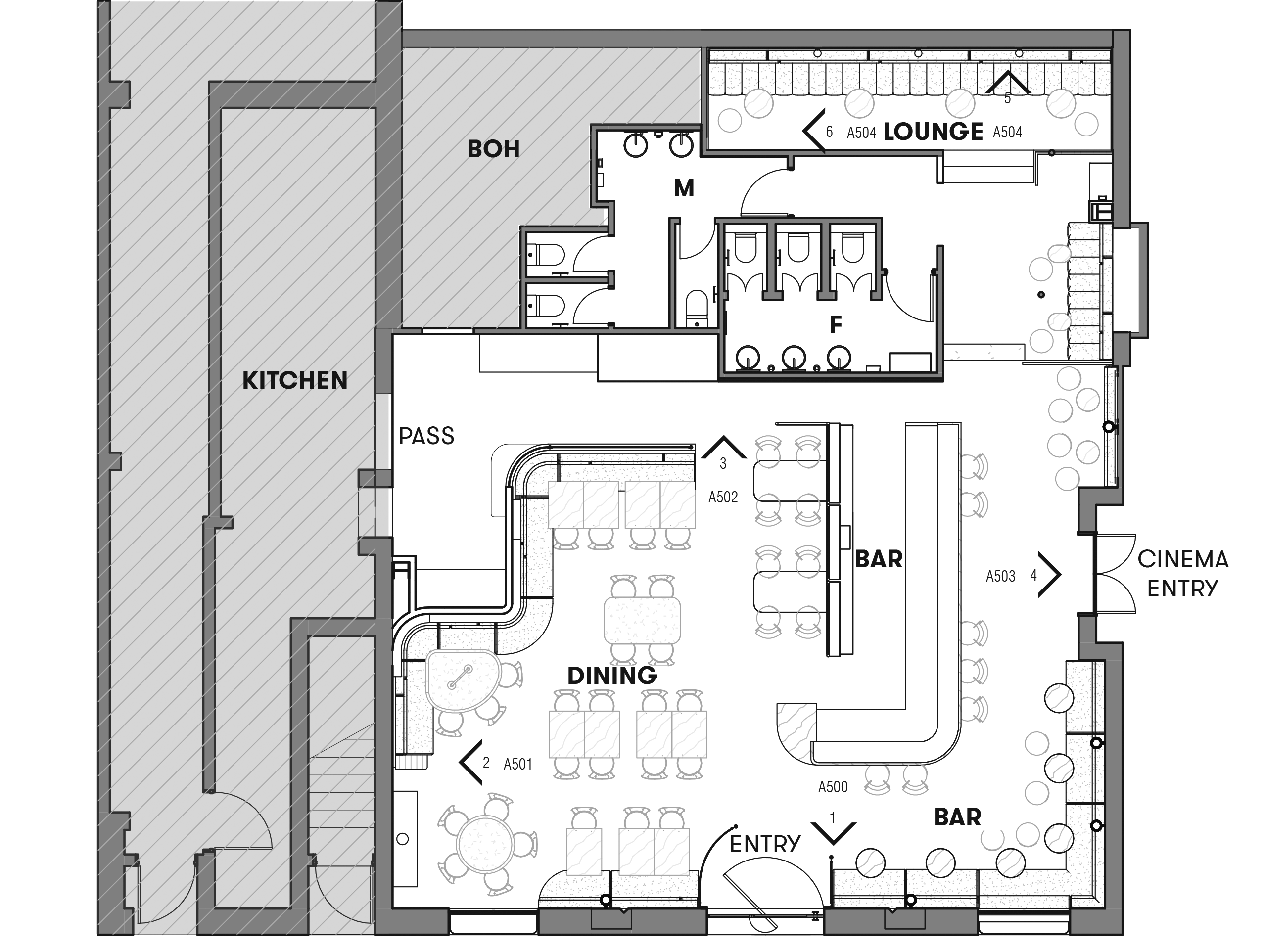 A stunning central bar captures the vistas from the cinema door and front entry door so that staff can immediately interact and greet customers as soon as they step into the space.
