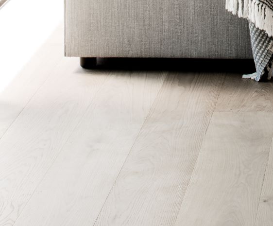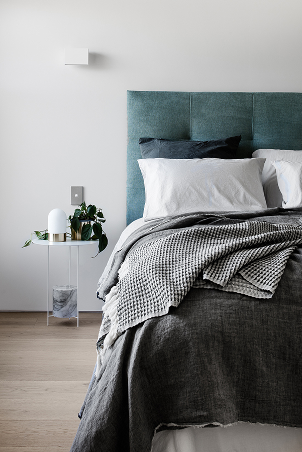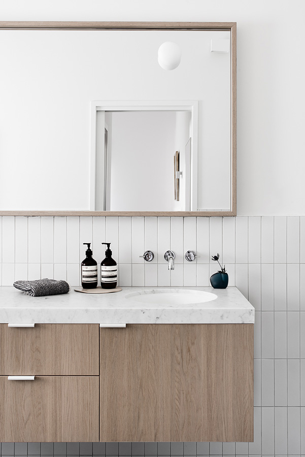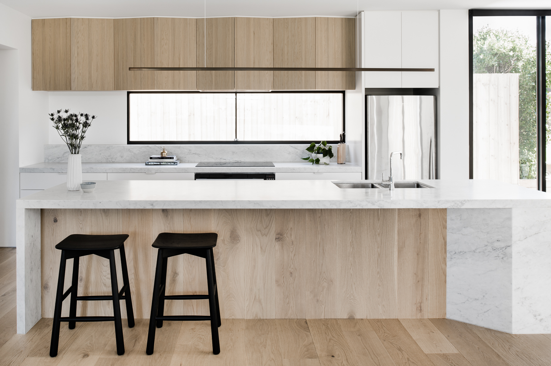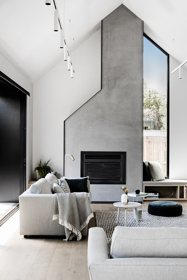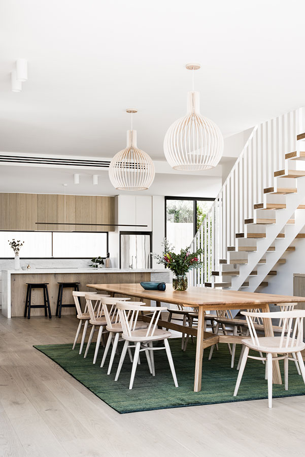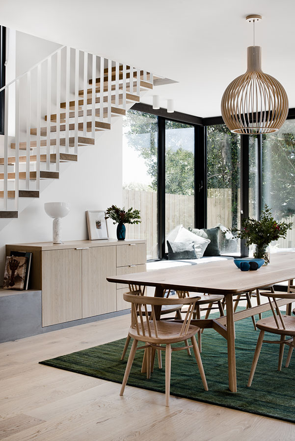 A light timber floor board in the interiors picks up the neutral colour scheme of the exterior.
