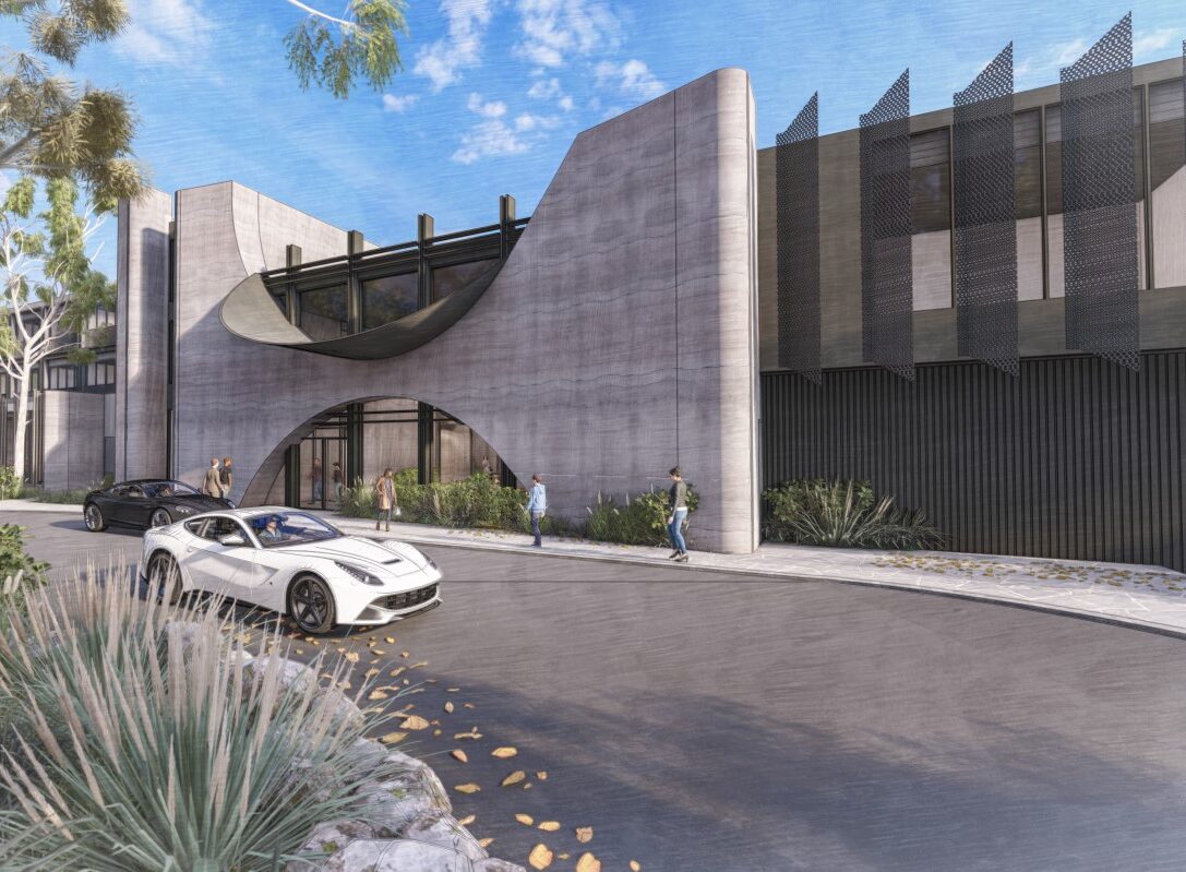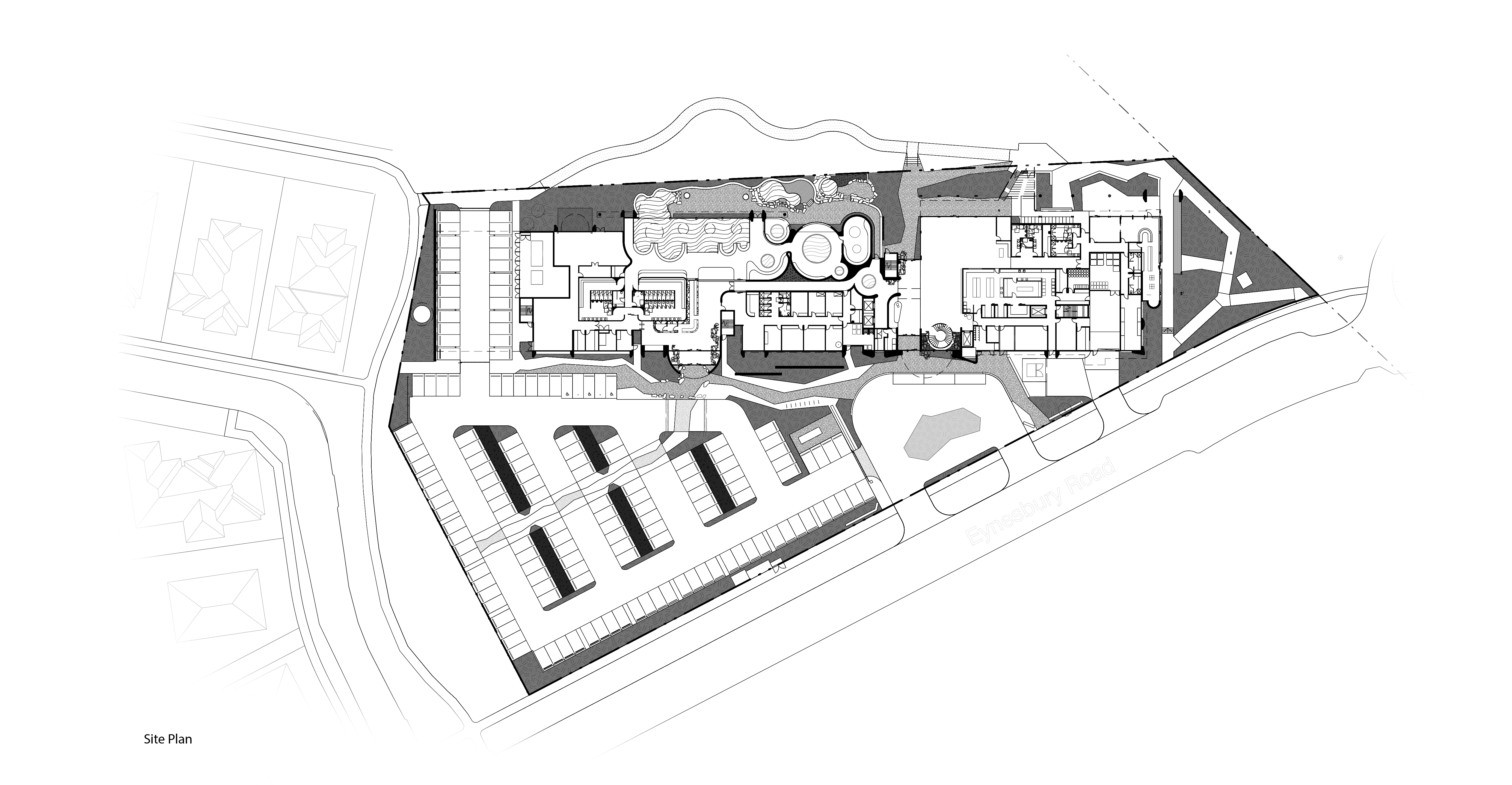 The car park forecourt is an urban forest that considers environmentally sensitive design, with integrated landscaped storm water management and low level landscape elements. Layered landscape buffers and large canopy trees provide sectioning and shade over pedestrian zones.