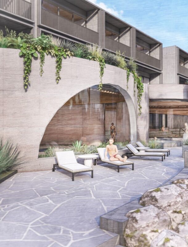 The layering of colours, materials, and spaces provides a sensory experience that promotes relaxation and rejuvenation. Framed and filtered views connect guests to the landscape and offer a sense of privacy and seclusion.