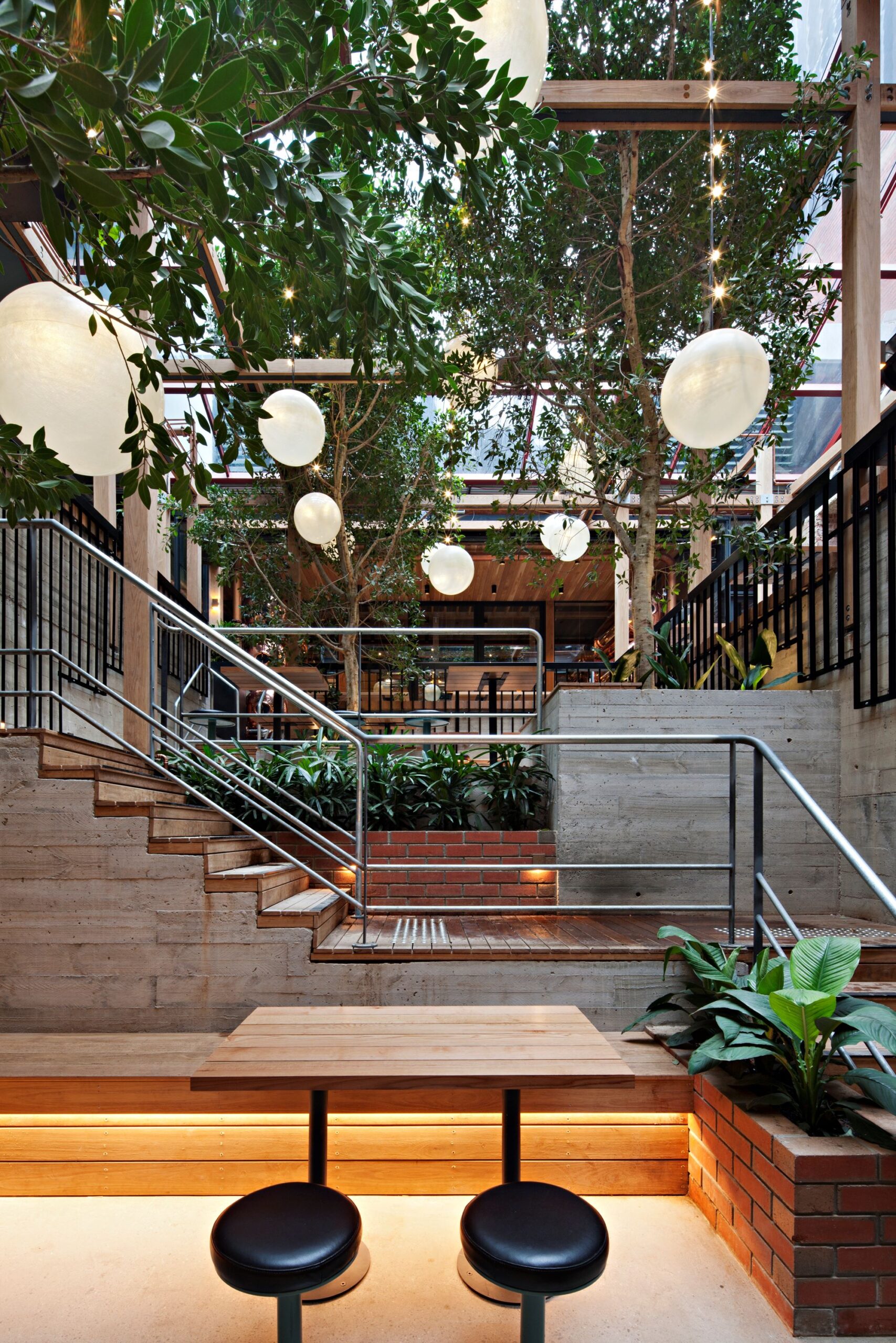 The Garden State is an ambitious 2000m² project, with a capacity for 840 patrons. It preserves much of the original textile factory’s shell and sawtooth roof while opening its central bays to form a terraced beer garden that has the feel of a reinvigorated industrial ruin, a layered hidden botanical haven to be explored.