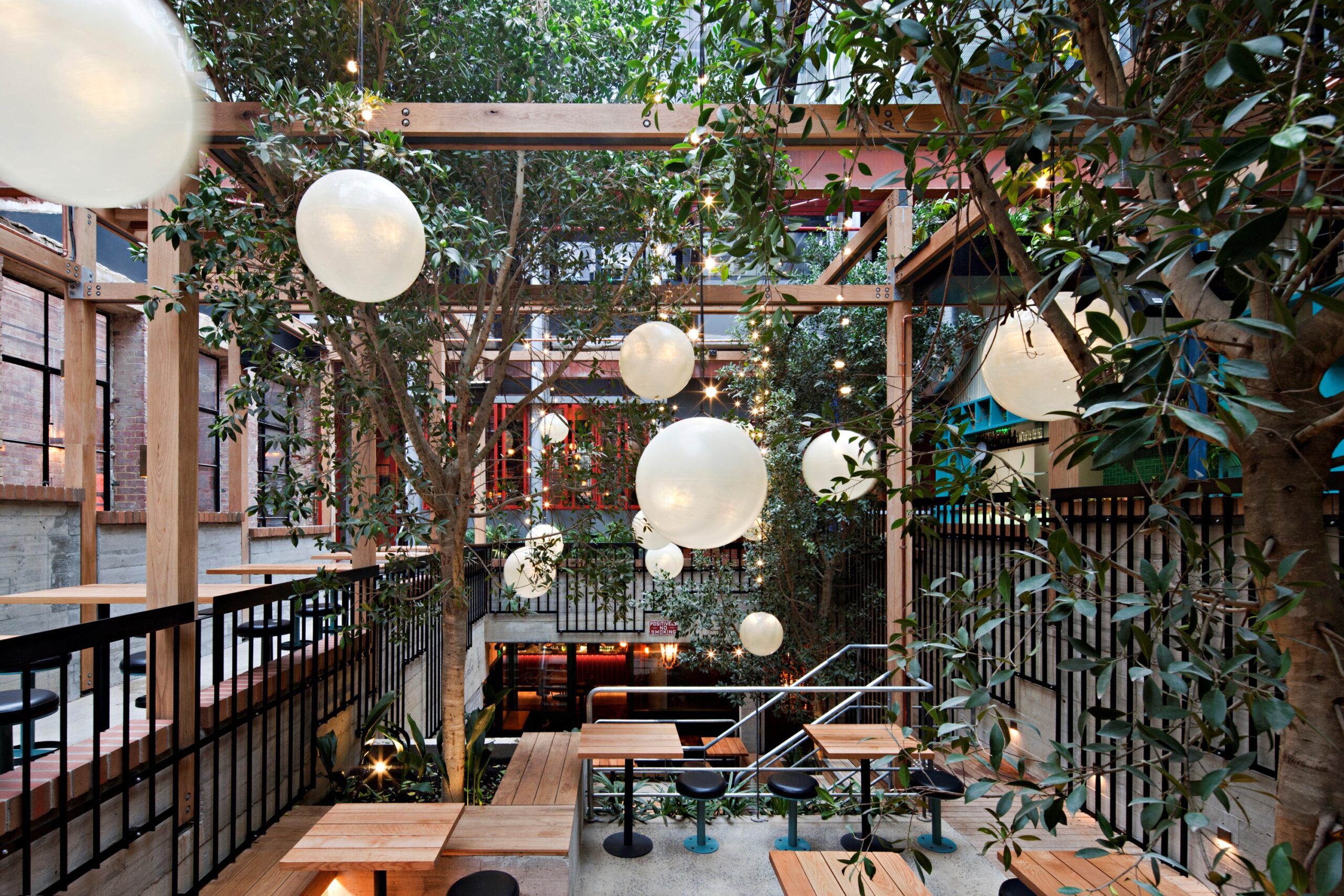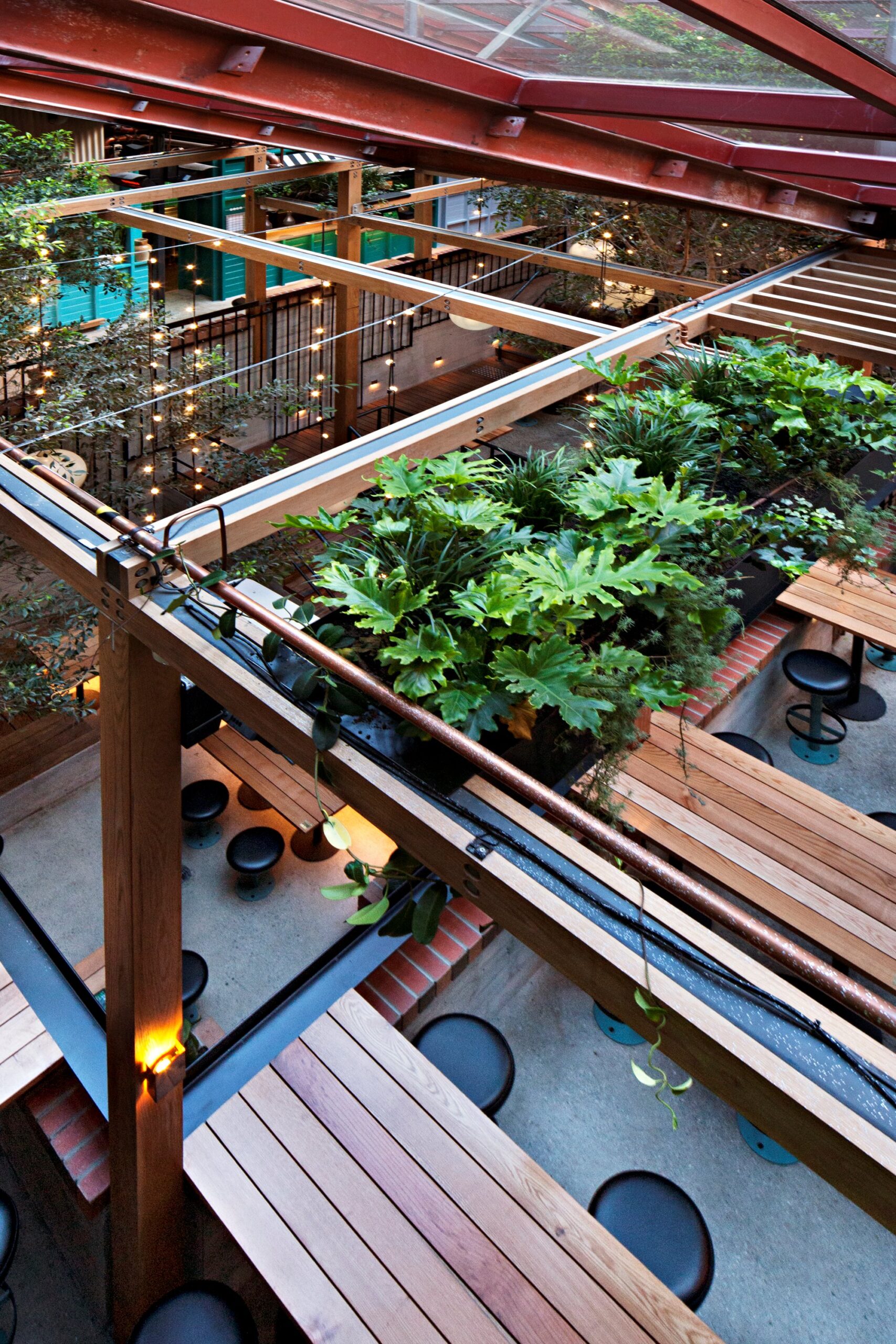 The Garden State is an ambitious 2000m² project, with a capacity for 840 patrons. It preserves much of the original textile factory’s shell and sawtooth roof while opening its central bays to form a terraced beer garden that has the feel of a reinvigorated industrial ruin, a layered hidden botanical haven to be explored.