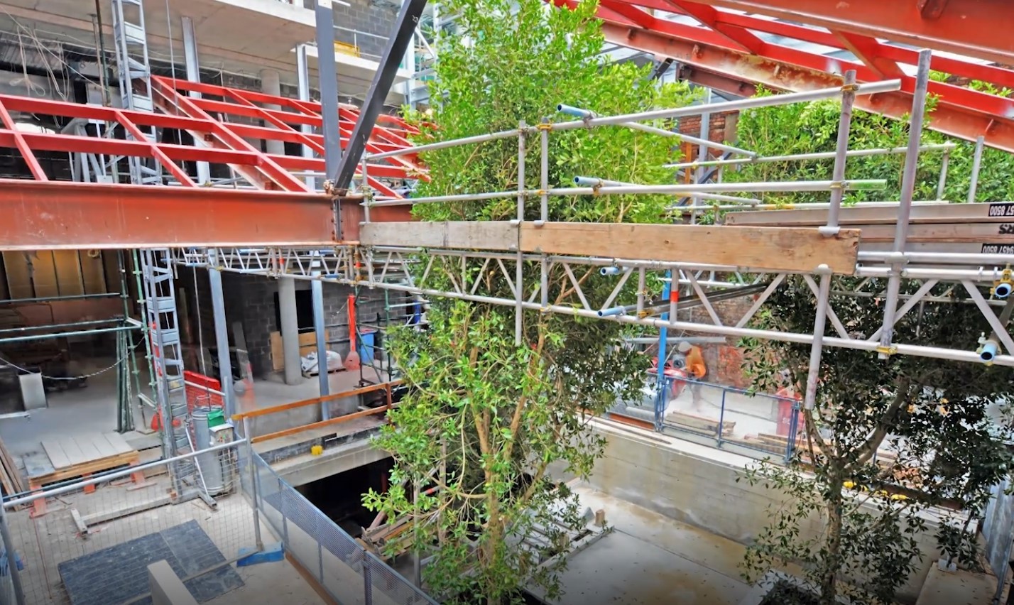 The raw construction materials are largely exposed, reducing the need for additional cladding and finishing materials. A good amount of the existing building fabric was retained thereby reducing the embodied energy of new materials. Retained fabric includes masonry walls and steel glazing, sections of flooring, floor structure, roof structure and roof cladding. In addition, existing materials from the demolition were re-used where possible.