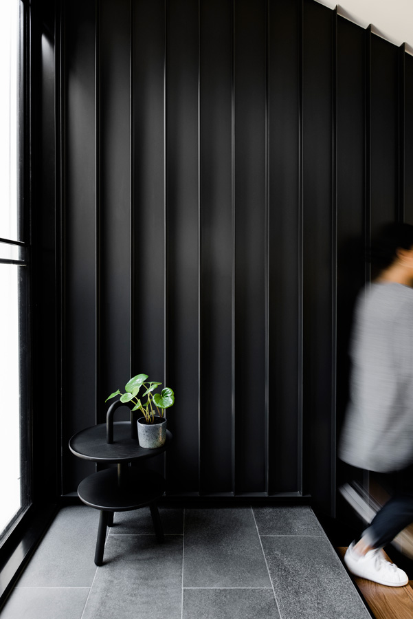 Charcoal Standing Seam Cladding. Traditionally an exterior finish, references the bold structure of the building’s façade.