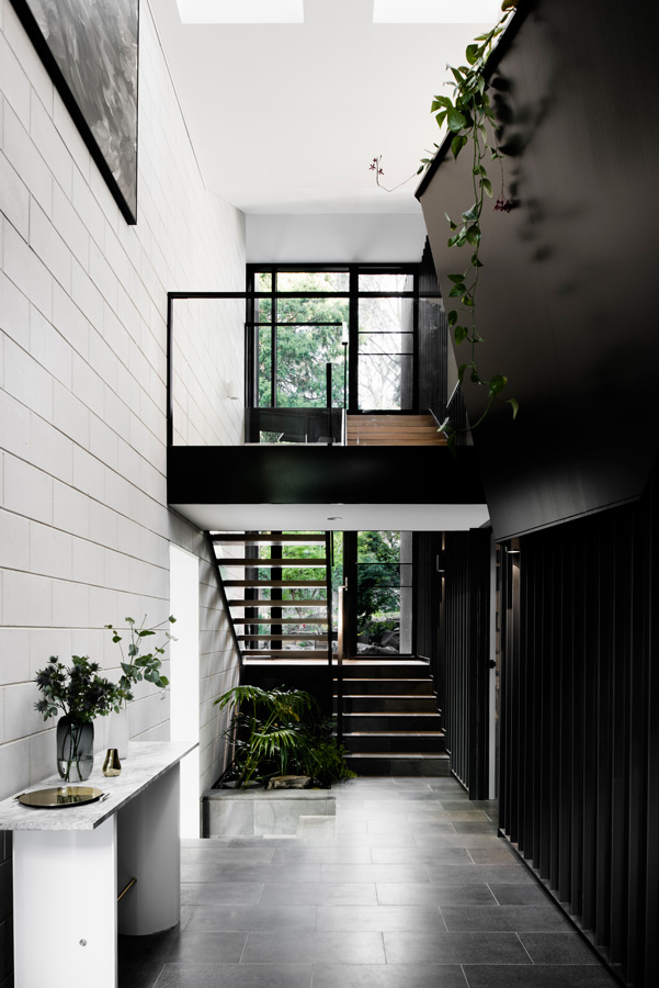 A dramatic main entry and atrium space embodies the spine of the house and serves as a transitional space between the levels and main areas of the home. Contrasting the dark, structured atrium with the light, open living areas that branch off it achieves a sense of continuity between the interior and exterior spaces.