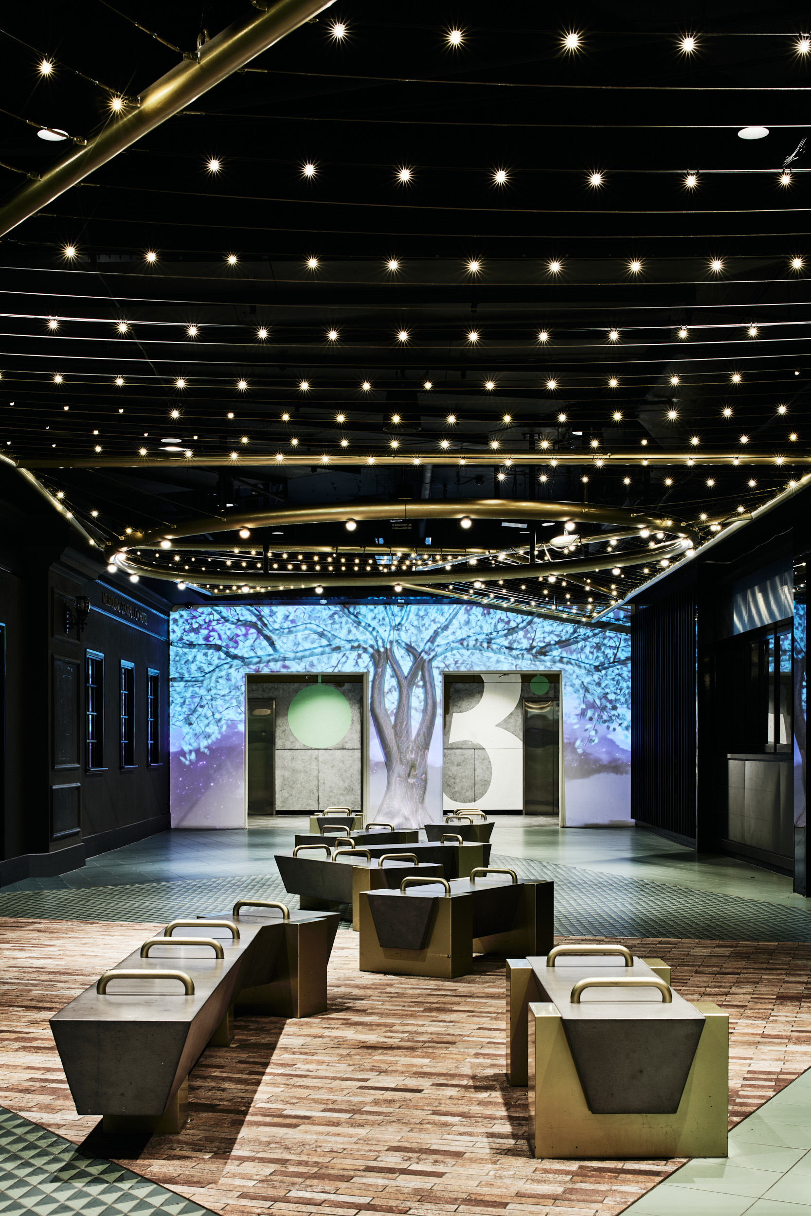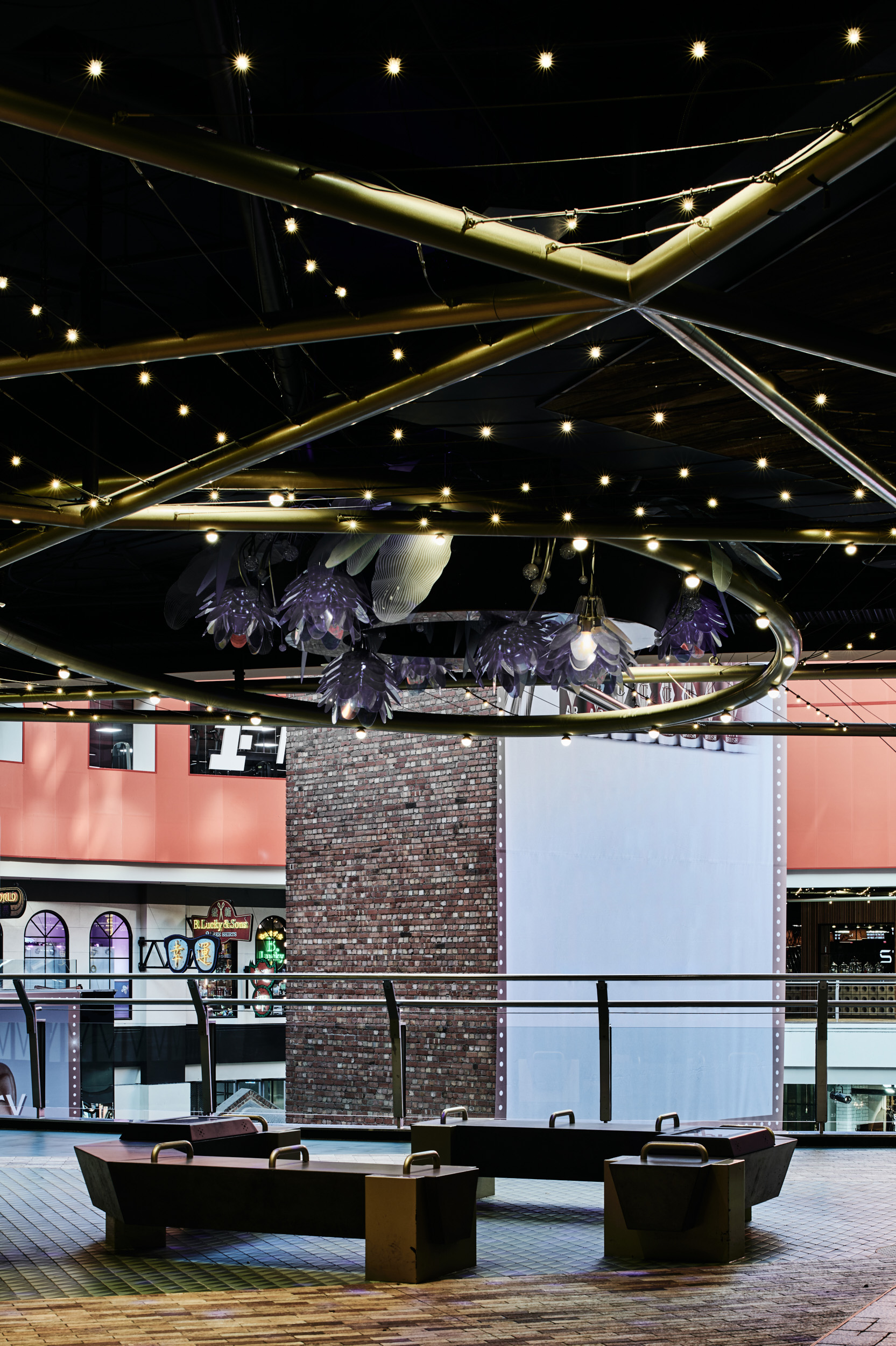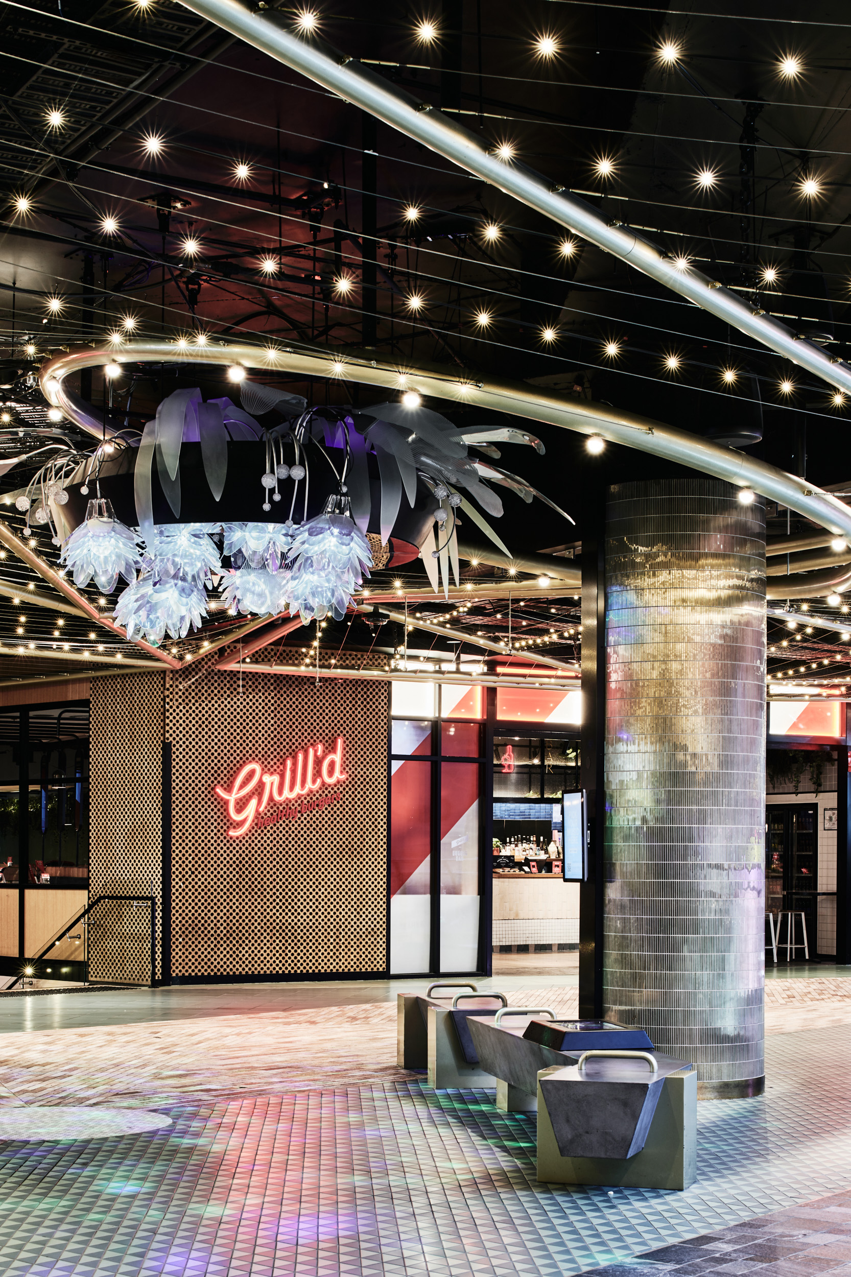 “Taking inspiration from the famous Melbourne Central glass cone that envelopes the Shot Tower, we looked to recreate this webbed structure across the ceiling, joining the various tenancies and walkways together with a fine, metallic thread.