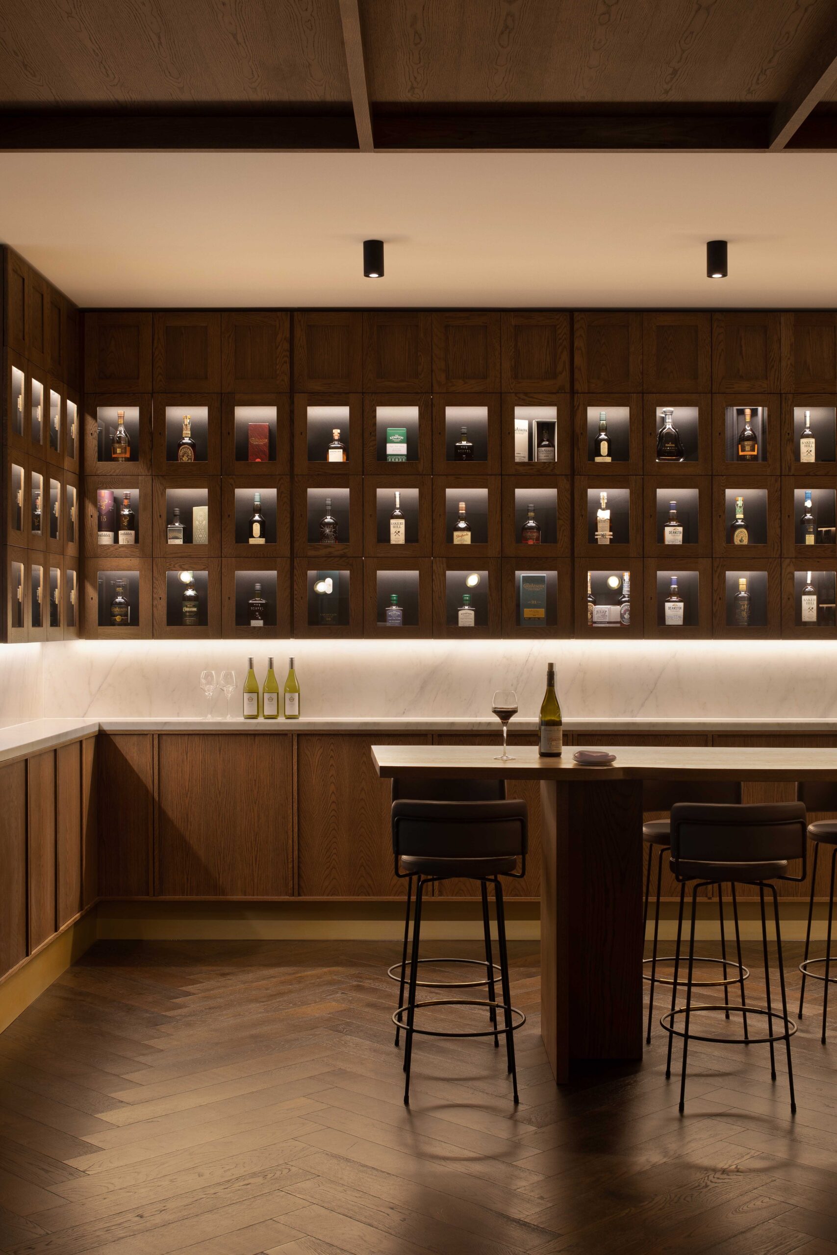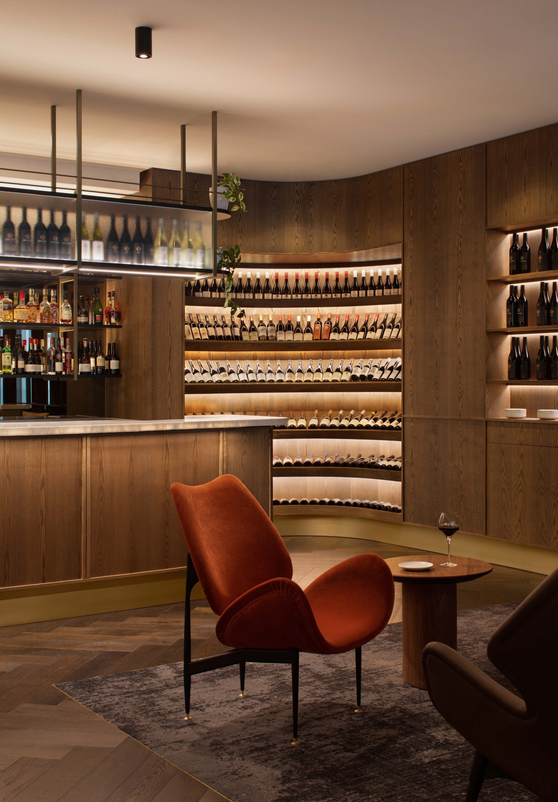 “The Club’s eclectic offering of wines is displayed as a sculptural extension to the back bar sweeping around the corner, enabling the patrons to engage, admire and personally select their wine.