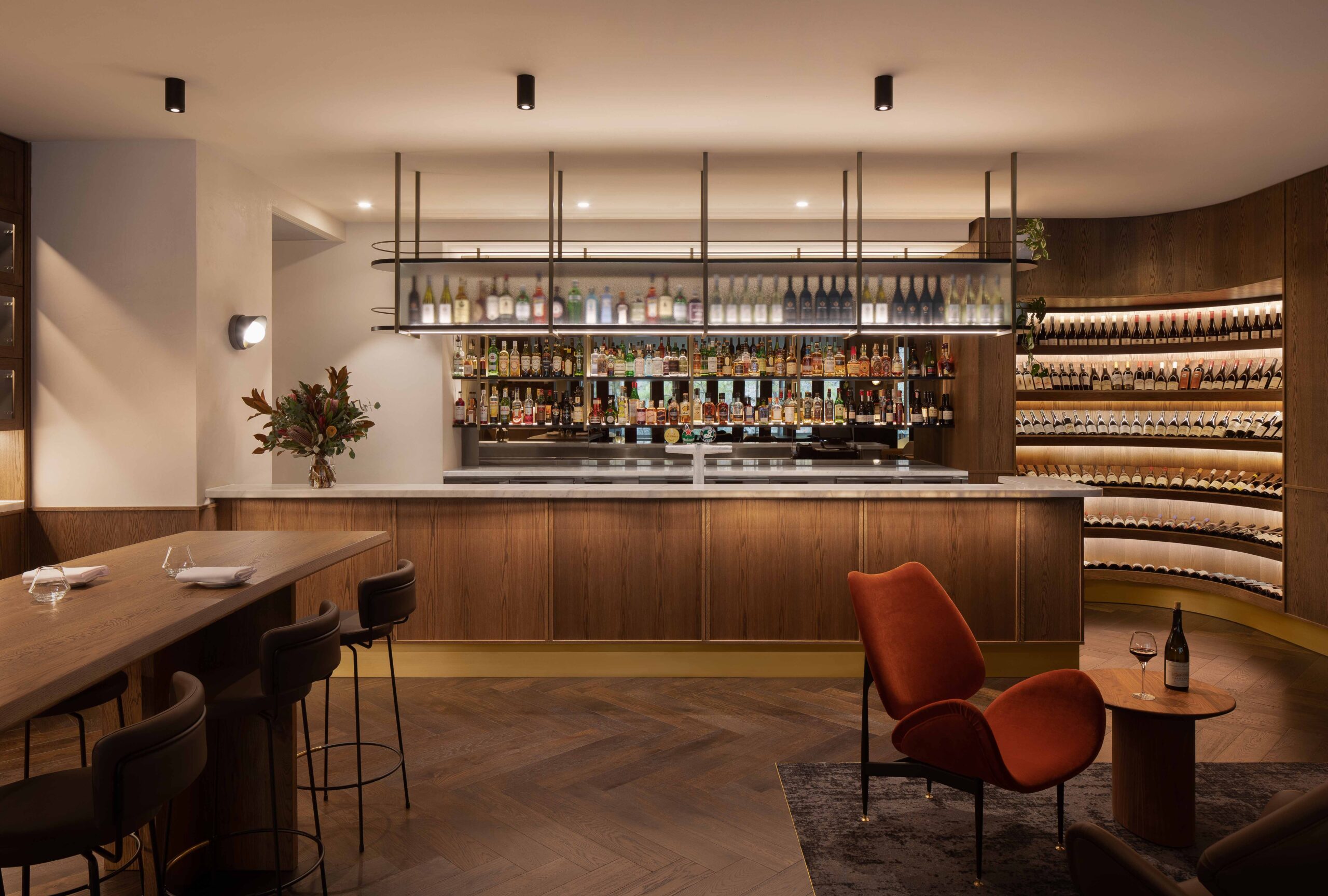 “The Club’s eclectic offering of wines is displayed as a sculptural extension to the back bar sweeping around the corner, enabling the patrons to engage, admire and personally select their wine.
