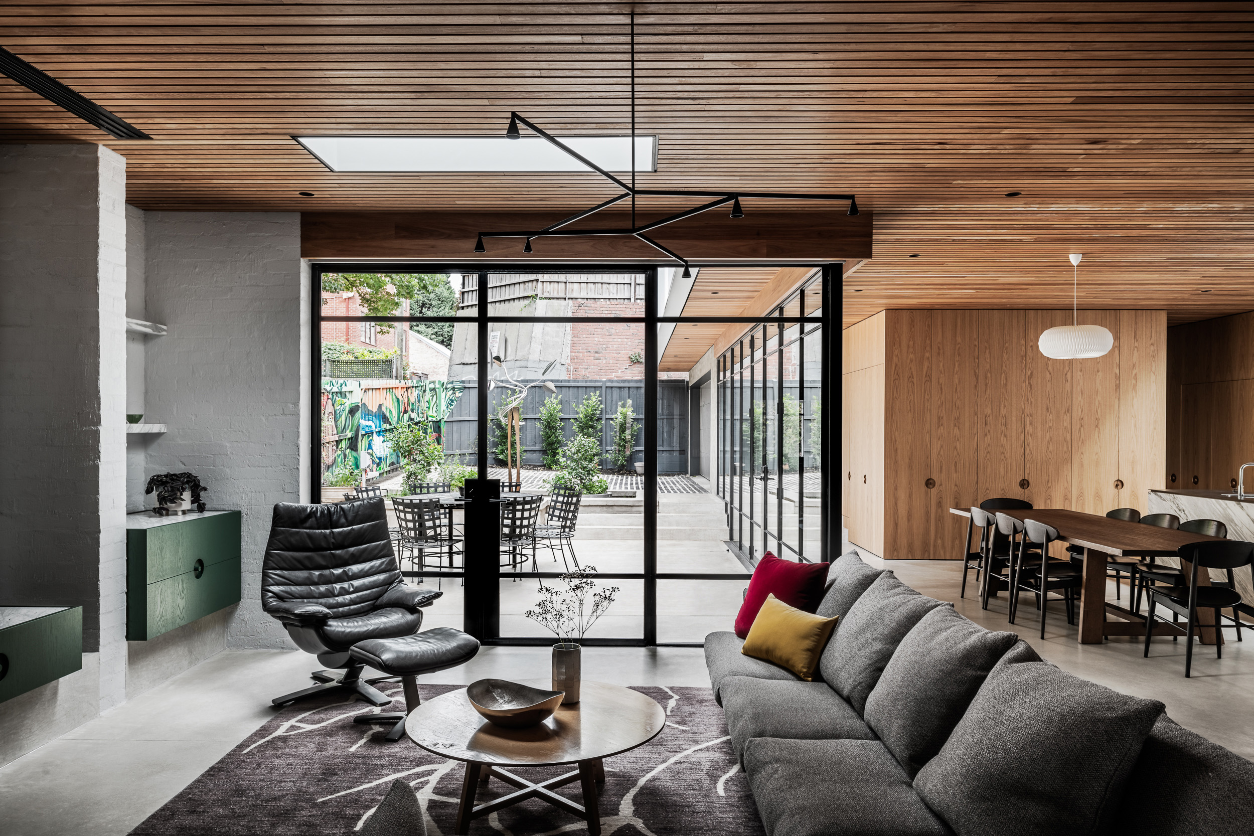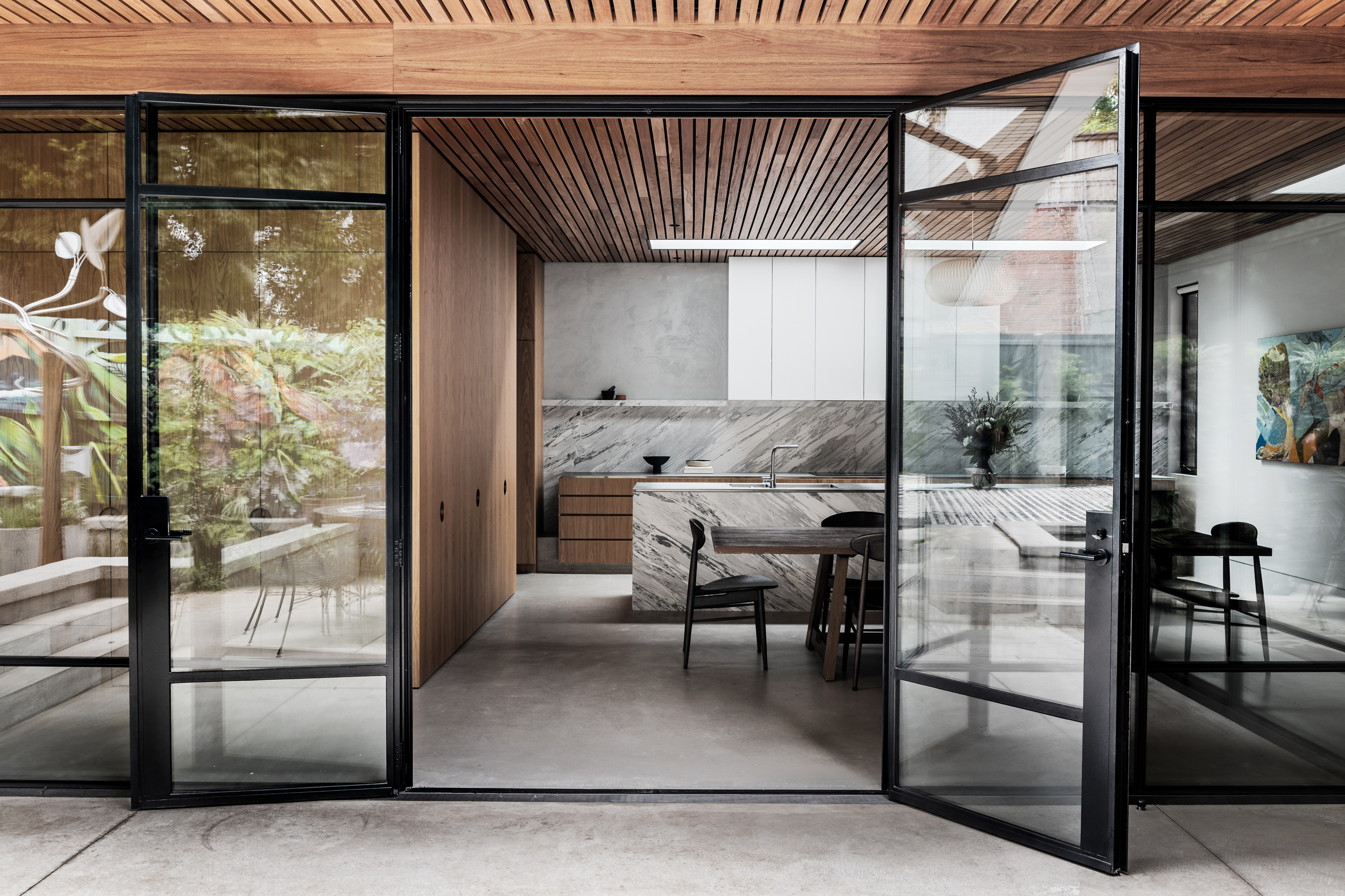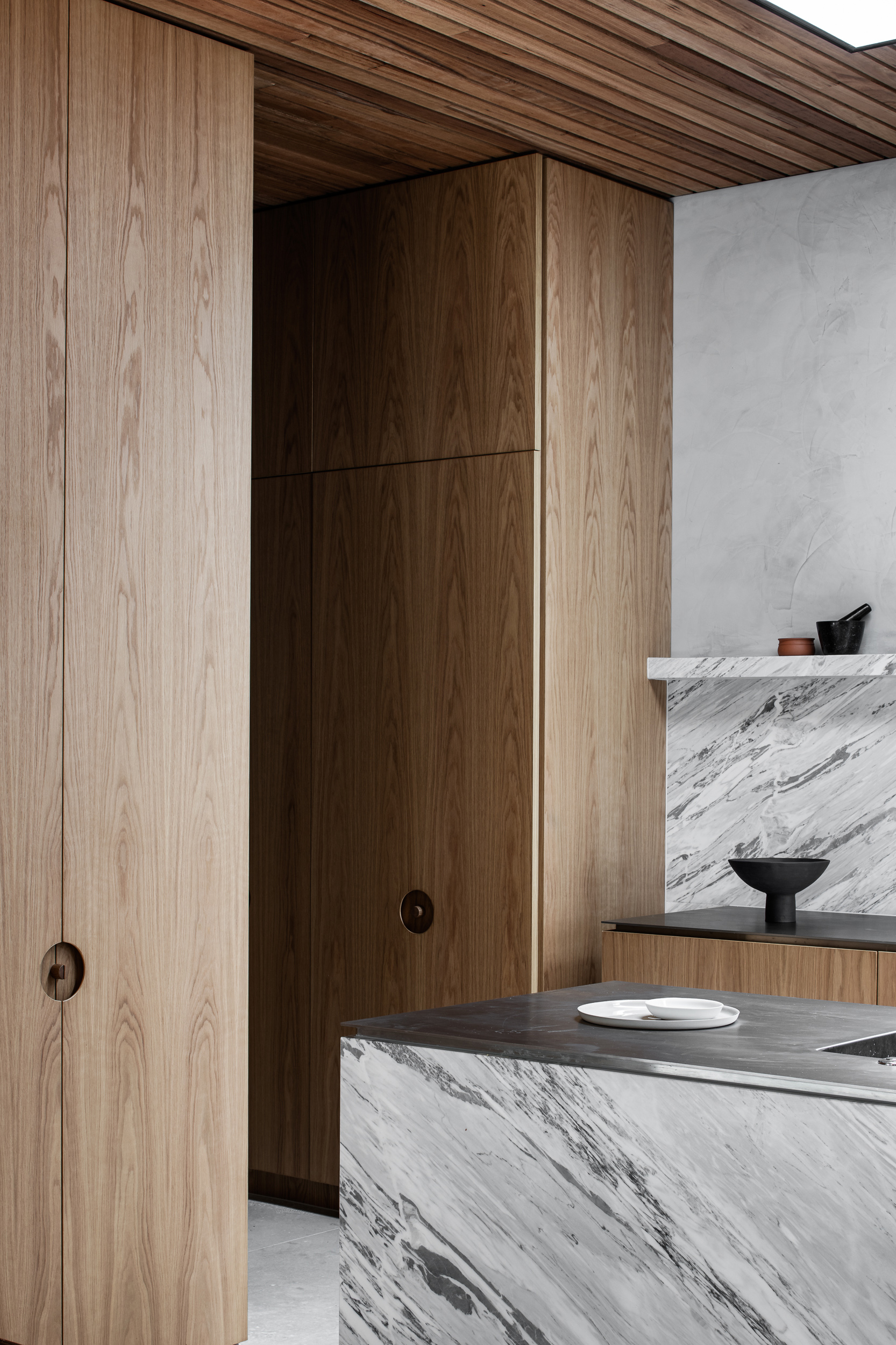 A Tasmanian oak ceiling brings warmth and texture to off-set the colder materials underfoot.