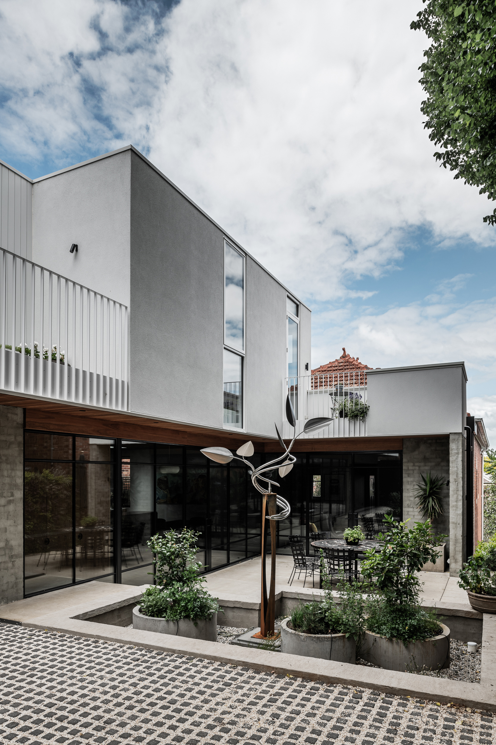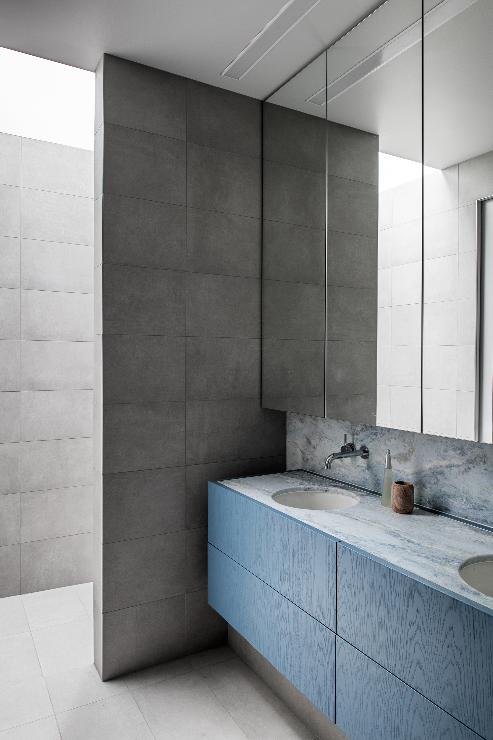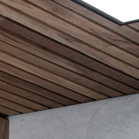 A Tasmanian oak ceiling brings warmth and texture to off-set the colder materials underfoot.
