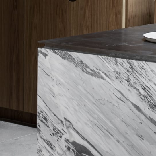 A marble-clad island bench and stainless-steel benches in the kitchen, complement the timber veneer joinery.