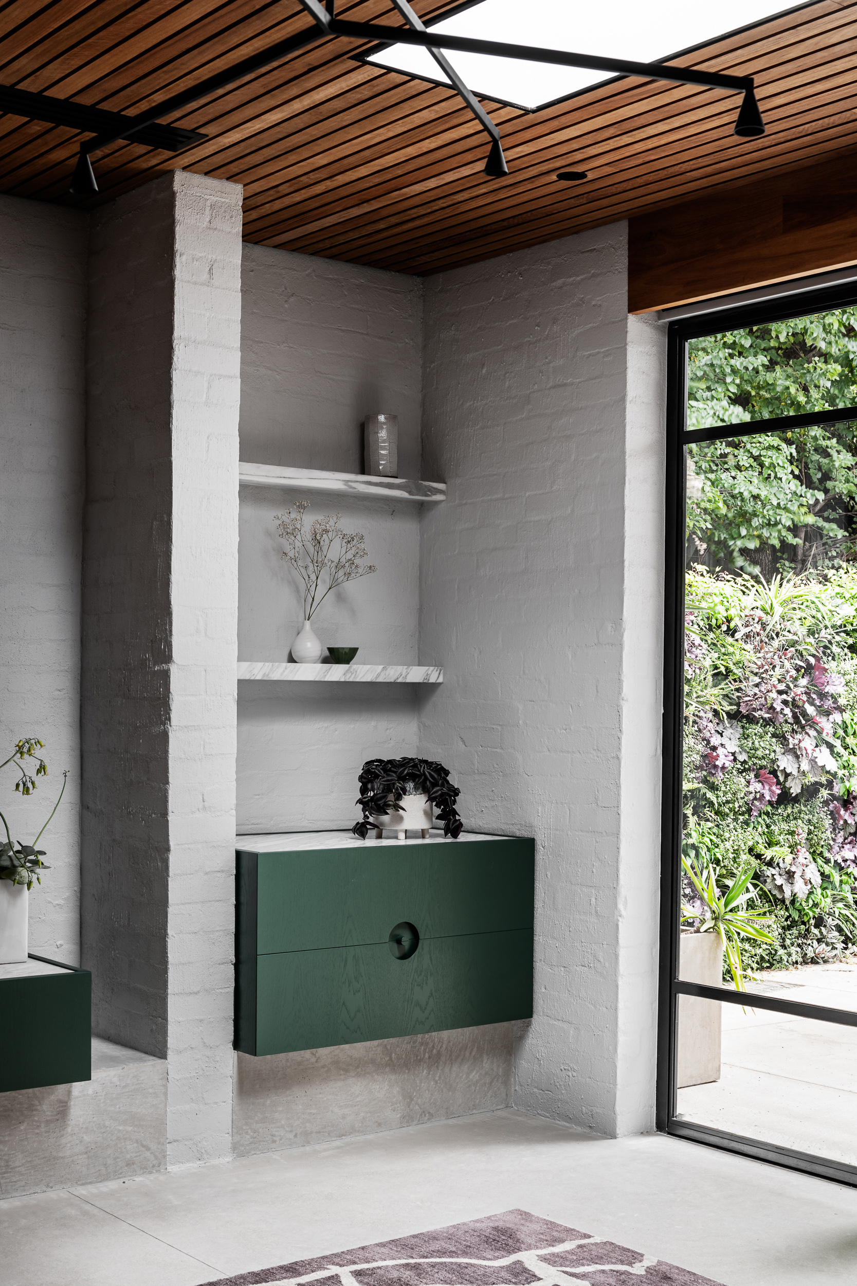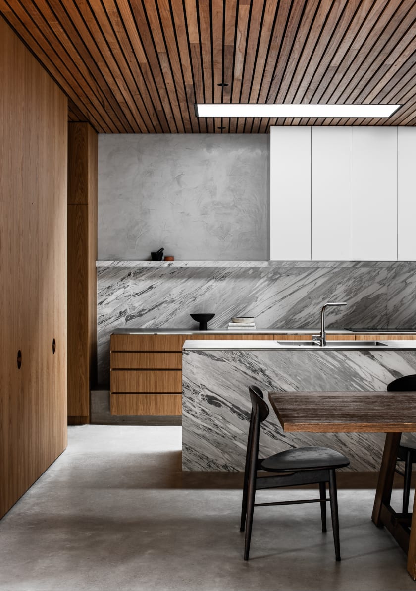 A Tasmanian oak ceiling brings warmth and texture to off-set the colder materials underfoot.