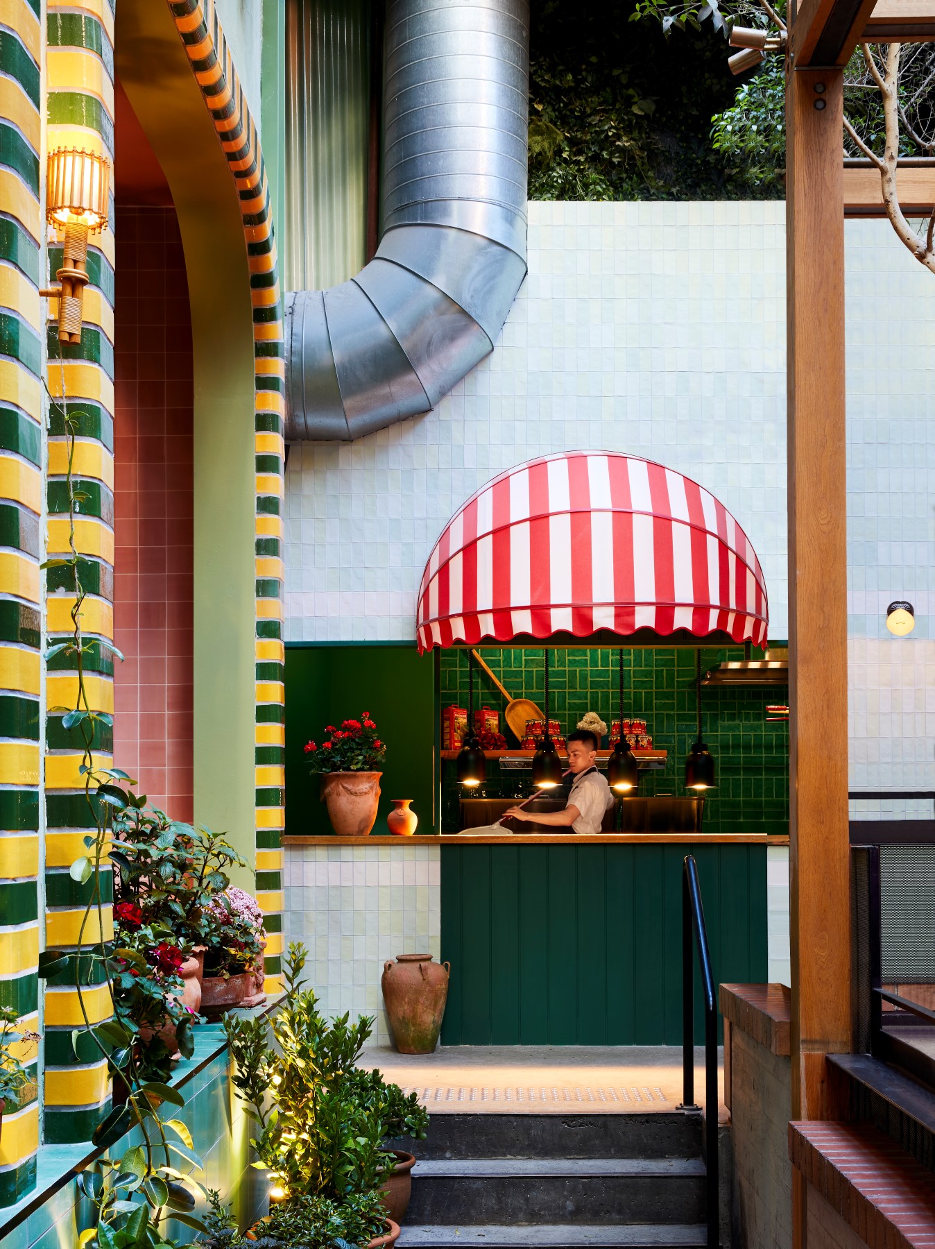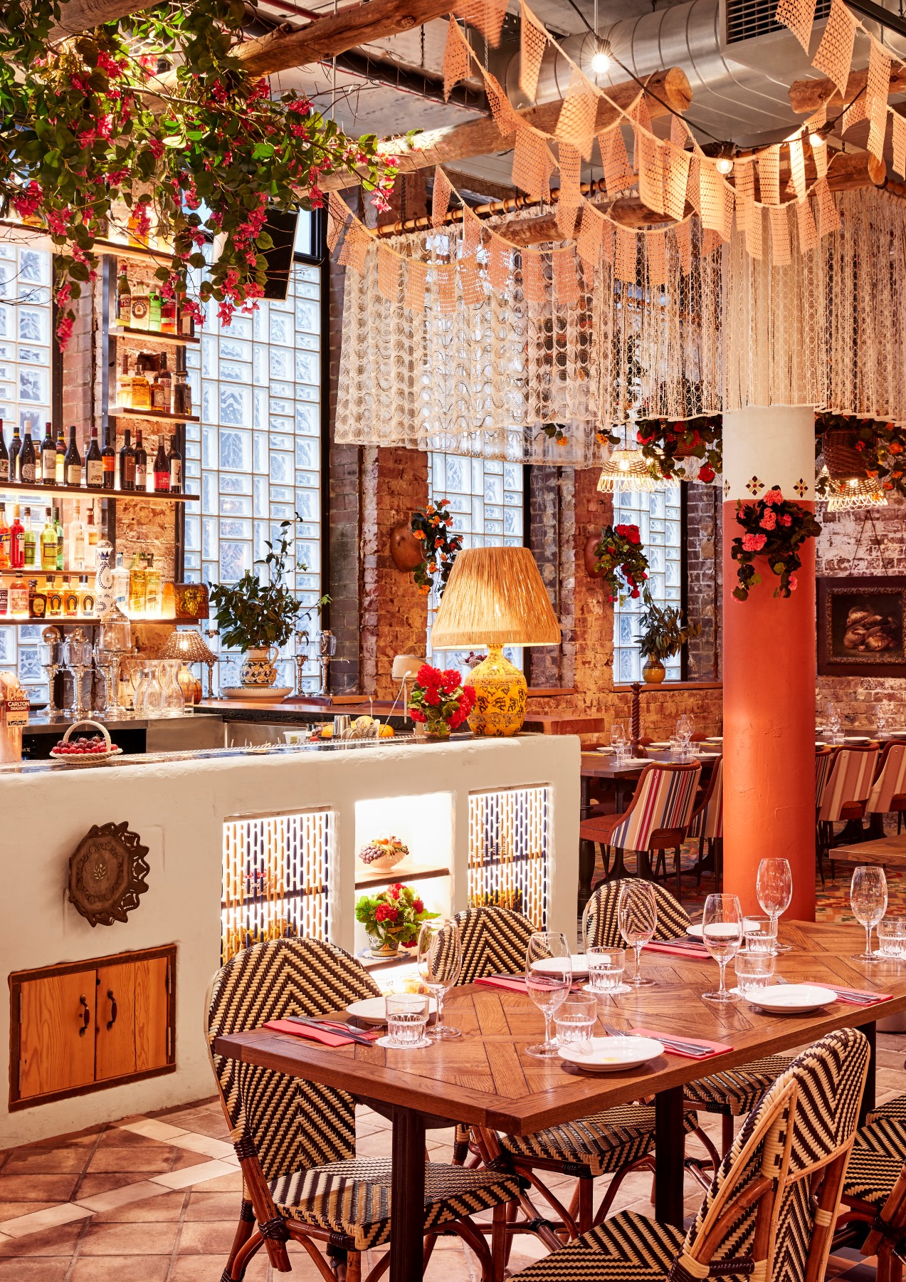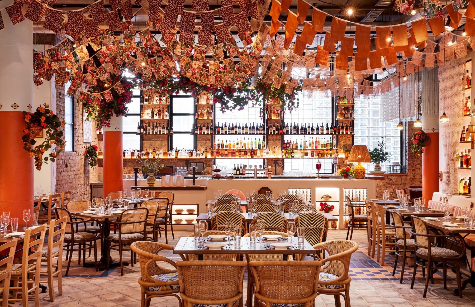 “Step inside and the illusion continues: ceilings festooned with festive bunting, reminiscent of small medieval towns with narrow cobblestoned laneways; backlit walls laden with pottery, bottles and greenery; and hints of the seaside”