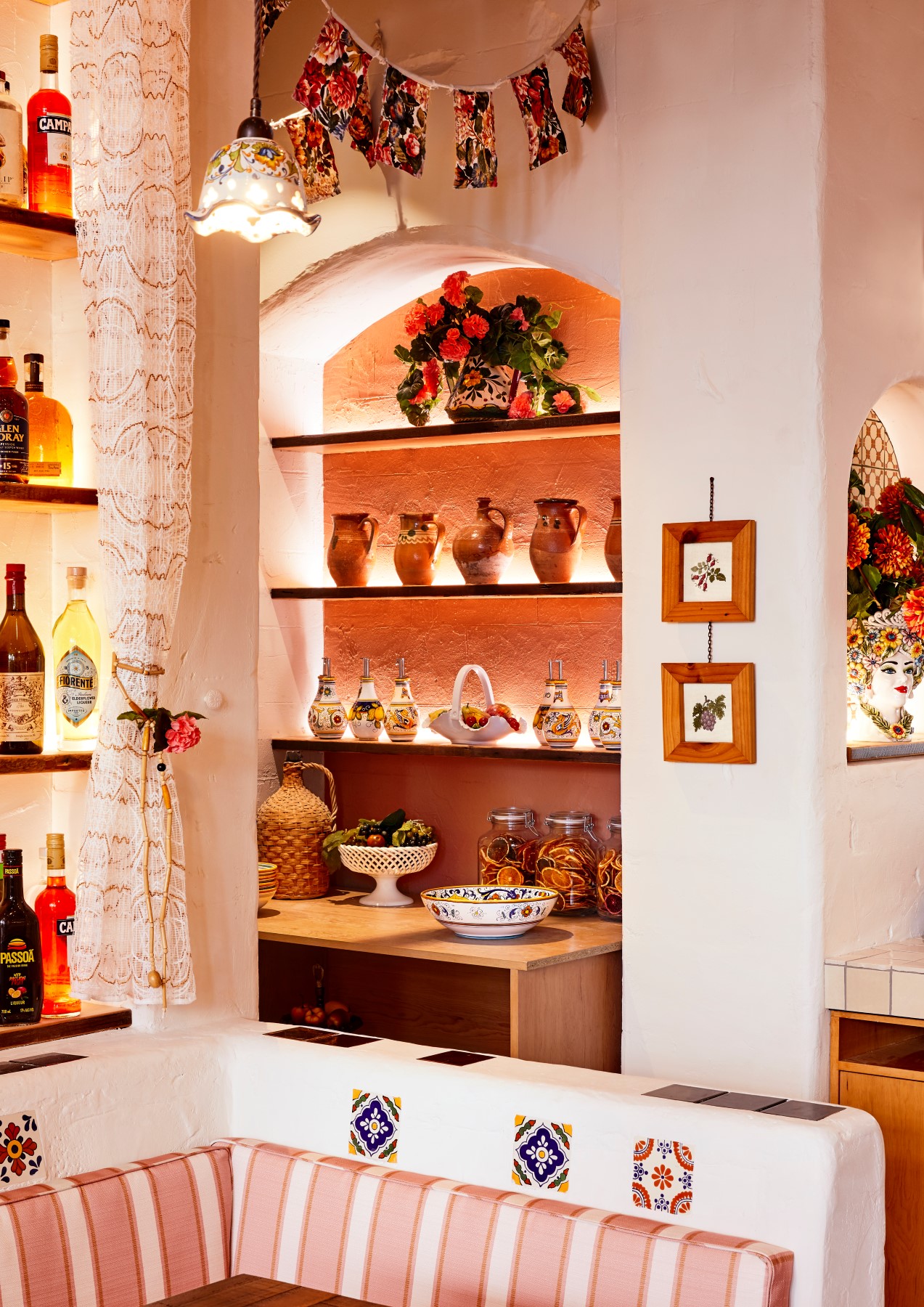 “Step inside and the illusion continues: ceilings festooned with festive bunting, reminiscent of small medieval towns with narrow cobblestoned laneways; backlit walls laden with pottery, bottles and greenery; and hints of the seaside”