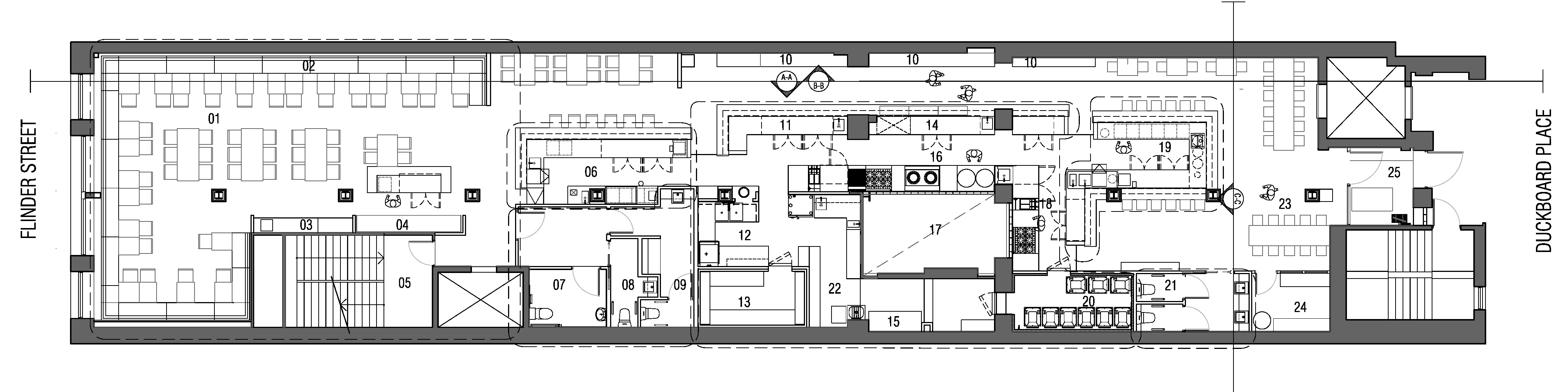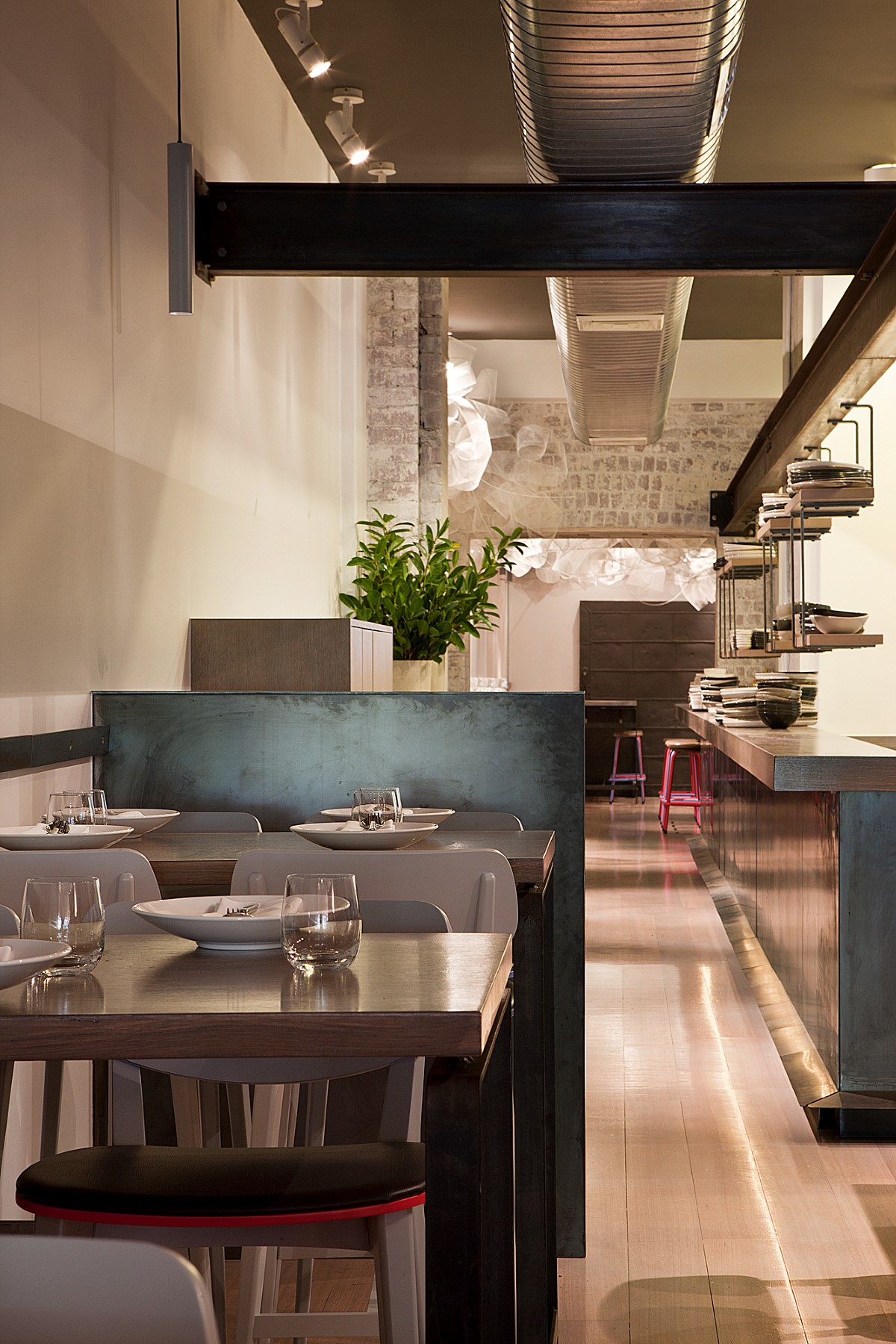 The design of Tonka responds to a uniquely challenging existing shell where limited access to natural light and the locations of existing services pushed program to either extremity of the long narrow tenancy; a bar area to one end and a dining room to the other. The kitchen exists in the centre and interacts with patrons of both sections in a genuinely engaging manner.